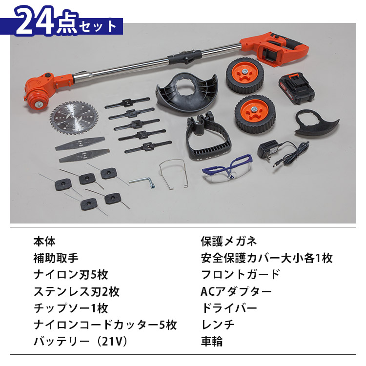 | 本体、補助取手、ナイロン刃5枚、ステンレス刃2枚、チップソー1枚、ナイロンコードカッター5枚、バッテリー(21V)、保護メガネ、安全保護カバー(大)・(小)各1枚、フロントガード、ACアダプター、ドライバー、レンチ、車輪 |