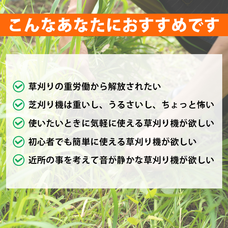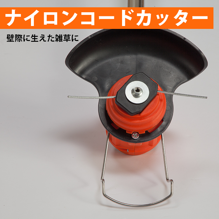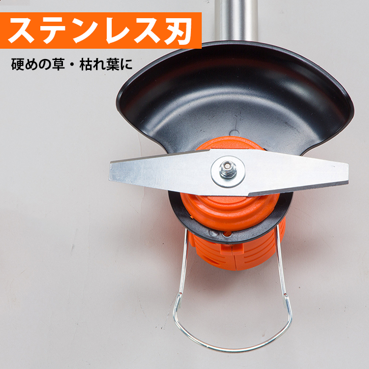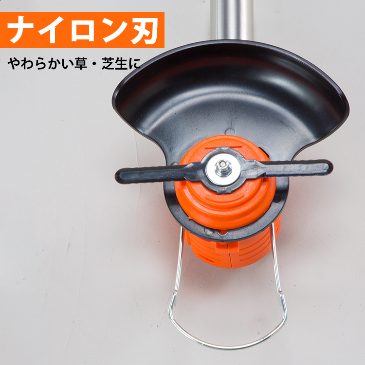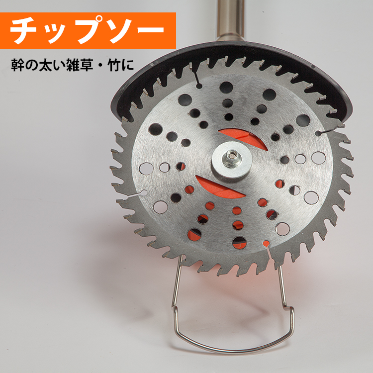 | 1.ナイロン刃:やわらかい草・芝生 2.ステンレス刃:硬めの草・枯れ葉 3.チップソー:幹の太い雑草・竹 4.ナイロンコードカッター:壁際に生えた雑草 |