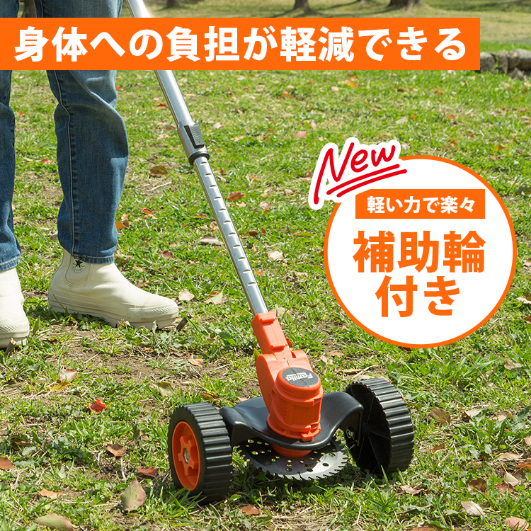 | 草刈機を浮かしながら使う従来品とは違い、軽い力で楽々作業が捗る補助輪タイヤ付き。 コロコロ転がすだけでラクラク草刈りが行え、重量が分散されることで腕や肩、腰への負担が軽減できます! |