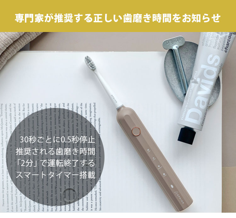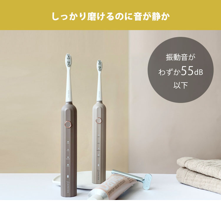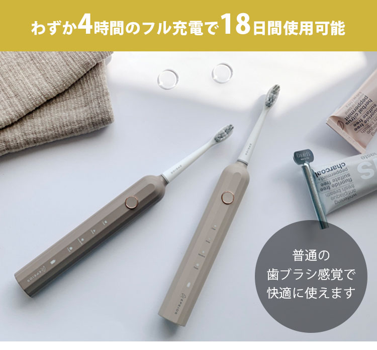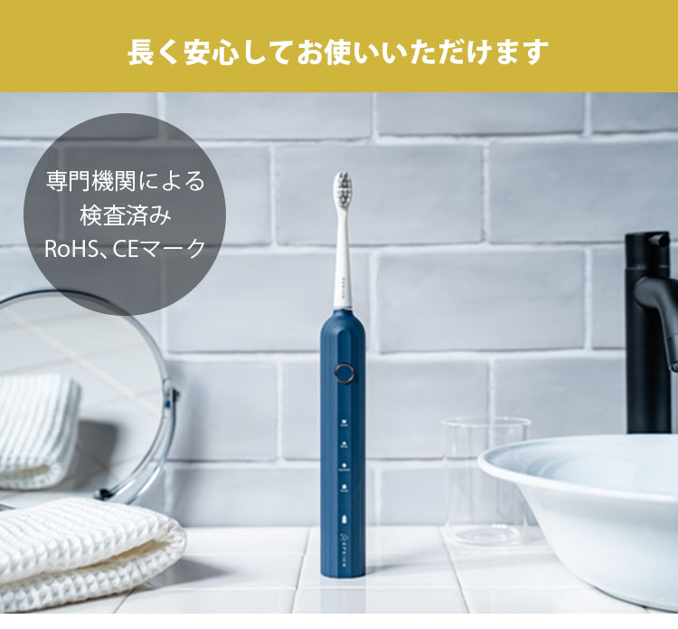 ![]() 音波技術により、毎分32,000回の高速振動が毛先の届かない歯間部までアプローチ。 手磨きのブラッシングに比べ、短時間で効率よくしっかり汚れを除去します。 ![]() 普通の歯ブラシ感覚で快適に使えます。 長時間の外出や旅行中でも、バッテリー切れの心配をすることなく気軽に持ち運べます。 ![]() 汎用性が高いUSB-C充電なので、パソコンなどから手軽に充電できるので便利です。 ![]() 洗面台が充電器だらけでゴチャゴチャになる心配がありません。 充電器を紛失した際もUSB-C充電器で給電できます。 ![]() デュポン社製W型ブラシ 柔らかで、高密度の毛先とW型のブラシを採用。 材質には吸水性が低く、細菌繁殖しにくいデュポン社製ナイロンを使用。 ![]() ブラシの押し付ける力が大きすぎると、自動的に振動力を低減する押し付け防止機能が歯と歯茎を保護します 歯茎が弱い方でもやさしく磨くことができるので、安心してお使いいただけます。 ![]() 電動歯ブラシ特有の騒音が大幅削減。 気になる振動音がわずか55dB以下と抑えられているので、ご家族が寝静まった深夜や、早朝など時間を問わずに、気持ちよくブラッシングできます。 ![]() あたりまえのようで今まで無かった防水機能。 一時的に水没しても、浸水することのないIPX7防水設計を採用。 お風呂でも安心してご使用できるので、リラックスタイム中のブラッシングで時間を有効活用できます。 また、本体を水洗いすることができるので、いつでも清潔な状態を保てます。 ![]() 本製品には、歯間の細かな汚れもしっかり落とす標準の「クリーンモード」 歯の表面を落とし白く磨き上げる「ホワイトモード」 歯の表面や歯肉のケアが気になる方のための「センシティブモード」 より丹念に効率的に磨き上げる「ポリッシュモード」 の4つのモードを搭載。 歯のコンディションに合わせて。モードを自由にお選びいただけます。 ![]() 30秒ごとに0.5秒停止し、専門家が推奨する歯磨き時間である「2分」が経つと運転を終了するスマートタイマーを搭載。 ![]() 本製品は専門機関による検査済みです。 毎日使うものだから、IPX7をはじめ、EU基準によるRoHS、安瀬性能基準を満たすことの証明であるCEマークを表示できる証明を専門機関から得ています。長く安心して毎日のオーラルケアを行っていただけます。 ![]() インテリアの統一感を損なうことがありません。 パッケージもこだわり、スタイリッシュなボックスなので、贈る方も、もらう方もうれしい特別なギフトとなることでしょう。 |