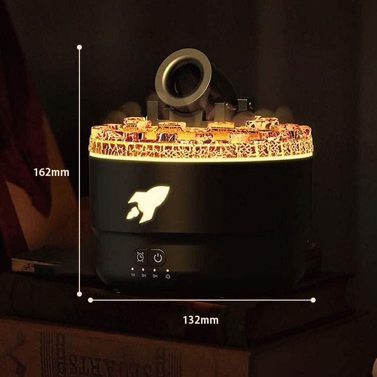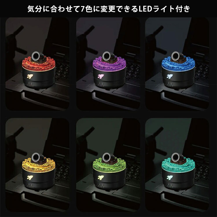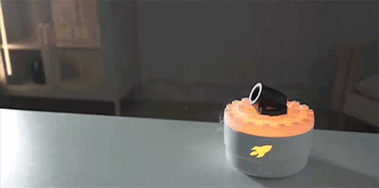 | 大砲デザインの噴射口からミストを放出します。また、火山の溶岩をイメージした部分からミストを霧状に拡散することもできます。 超音波式で細かいミストと生成するため、周りを濡らさず空気を潤します。 またお好みのアロマを加えてアロマ加湿器としてもご使用いただけます。 |
