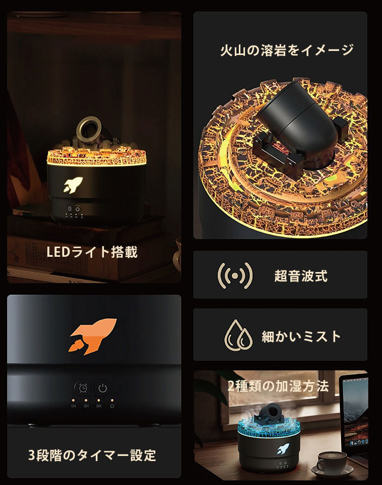 | 1.放出タイプ 大砲部分からミストを発射し、ピンポイントで加湿します。 他にはないユニークな加湿方法なので、友達との話題作りにもなります! 2.拡散タイプ 溶岩をイメージした部分から霧状にミストを拡散。じんわり広げて広範囲に加湿します。 見た目にもインパクトがあり大人も子供も楽しめます! |
