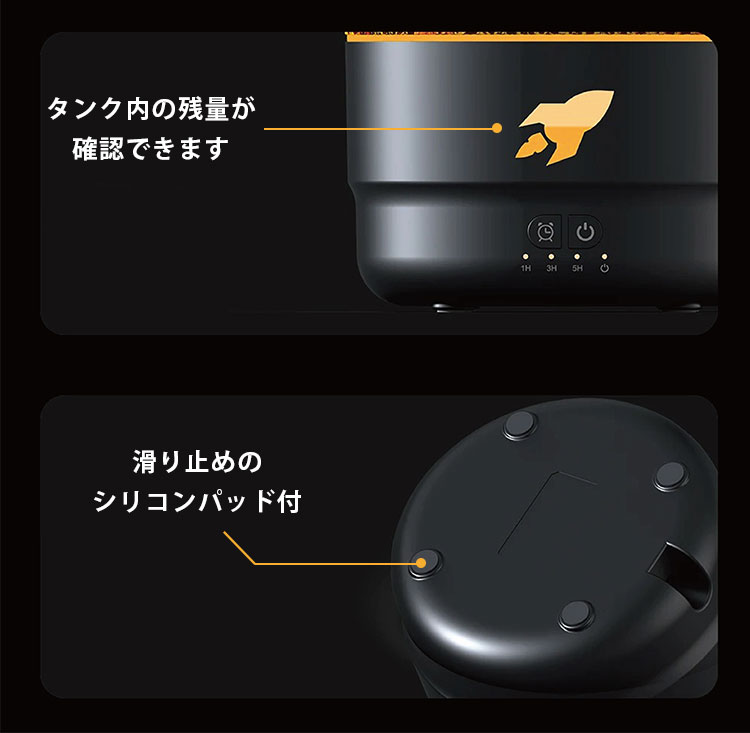 | ・大容量タンク 大容量200mlのタンク搭載!残量も一目でわかるデザインで、1日使用するのに十分な量です。 ・3段階のタイマー設計 1時間 / 3時間 / 5時間のタイマー設定が可能です。 ・静音設計 駆動音は25〜35dBと静音設計。就寝時に使用しても気にならないので睡眠の邪魔をしません。 ・滑り止め付き 底面には滑り止めのシリコンパッドが付いています。 |