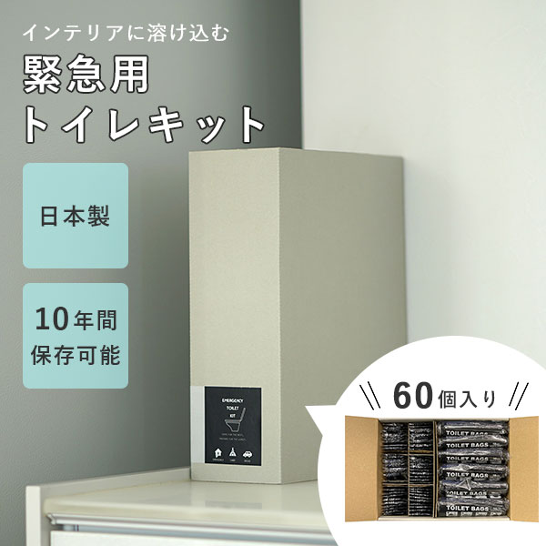 | 災害時の断水に備えてストックして置くと安心。 緊急時のトイレ処理ができる簡易トイレ60回セットです。 トイレに備えるだけでインテリアになる防災用品に見えない緊急用トイレキット。 公的機関で各種性能検査テスト済み、10年間保存可能な安心の日本製です。 |