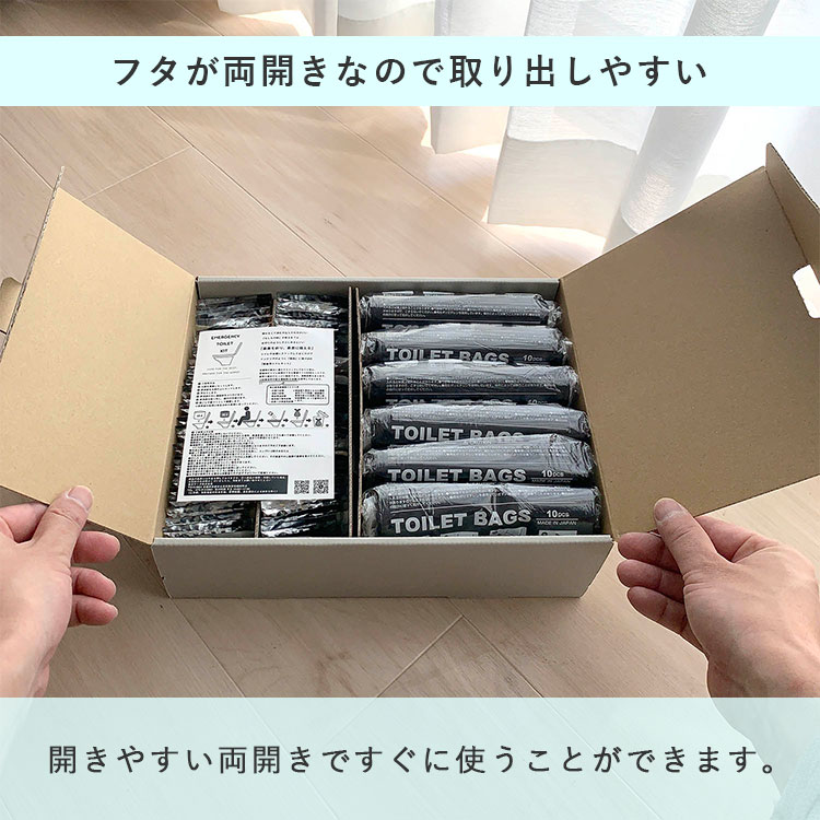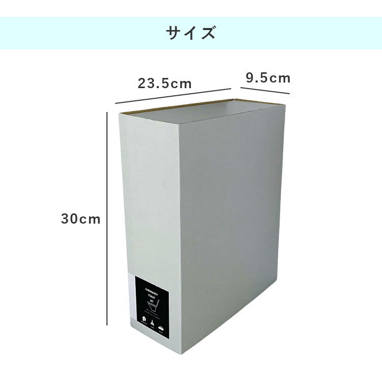 | ◇A4ファイルサイズ(変形)のおしゃれなパッケージ おしゃれなパッケージなので、毎日目に触れるトイレや洗面所にストックして、ポジティブに防災への備えを心がけられます。 ◇フタが両開きなので取り出しやすい パッケージをはずせば開きやすい両開きですぐに使うことができます。 ◇残数を確認しやすい仕切り付き 簡単にトイレキットの残りを確認することができます。 |