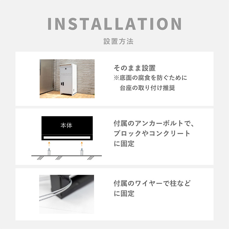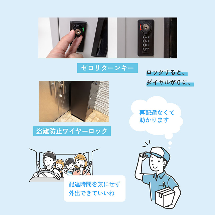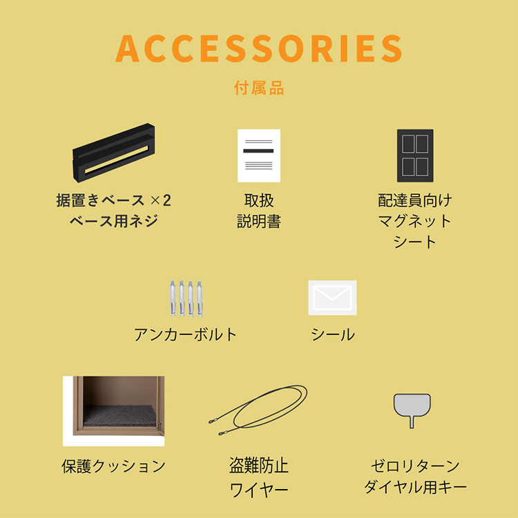 | セット内容・構成品 | ・取扱説明書 ・据置きベース×2 ・据置きベース用ネジ ・衝撃吸収パッド ・アンカーボルト ・盗難防止ワイヤー ・配達員向けマグネットシート ・シール ・ドライバー ・ゼロリターンダイヤル用キー |