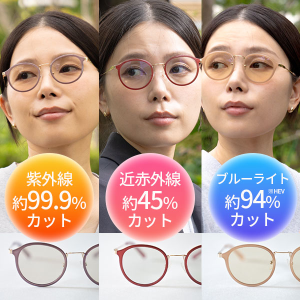 まるでメイクをしたかのように顔色を美しく演出し、女性の目元悩みを自然にカバーします。 透明感アップ:フレーム:ローズレッド × レンズ:ブルー クマを目立たなくする:フレーム:モーブパープル × レンズ:パープル シミ・くすみカバー:フレーム:サハラブラウン × レンズ:ブラウン |
