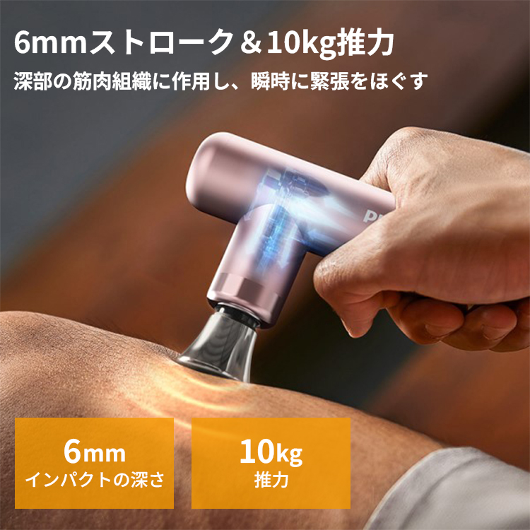 | ●SuperDynamic 電源システム SuperDynamic 電源システム、強力なパワーでスポーツパフォーマンスを発揮させます。カスタマイズされた非ダイナミックモーターを搭載し、最大3,200rpmの速度で、安定した出力が持続します。 ●6mmストローク&10kg推力 6mmのストローク深さと10kgの推力を提供するモーターは、深部の筋肉組織に作用し、瞬時に緊張をほぐします。 ※データは社内テストによるもので、参考値です。 フルパワー時のストロークは最大6mm±0.5mm、筋膜ガンの推力は10±0.5kg。 ●4種類のマッサージヘッドを装備 各筋肉群の力特性とリラクゼーションのニーズに応じて、4 個のカスタマイズされたマッサージヘッドが設定されています。ターゲットを絞ったマッサージが可能で、瞬時に筋肉をリラックスさせることができます。 ●5速振動周波数 5段階の調整可能なギアに対応しており、2,000〜3,200rpmの振動周波数でさまざまなリラクゼーションの要求に応えます。 ●ミニマルなノブ設計 シンプルなノブ設計で1回ひねるだけで強度を調整でき、初心者でも操作が簡単です。速度が一目でわかるマルチカラー表示となっています。 ●286gの軽量ボディ アップグレードされた軽量ボディはわずか約286g。手首への負担を軽減し、フロスト加工メタルデザインにより、繊細で滑りにくく、握り心地も快適です。コンパクトなサイズで持ち運びしやすく、疲れた体をいつでもマッサージできます。 ●握りやすいT字形ボディ T字形のデザインは人間の手に適しており、快適でしっかりとしたグリップで滑りにくく、長時間使用してもあまり手が震えません。 ●長時間バッテリー&コードレス 1,500mAhの大容量バッテリーを内蔵し、1 回の充電で約120分間使用可能。USB Type-Cからの充電に対応。コードレスで場所を選ばず使えるので、自宅はもちろんオフィスやジム後にも手軽に使用できます。 |