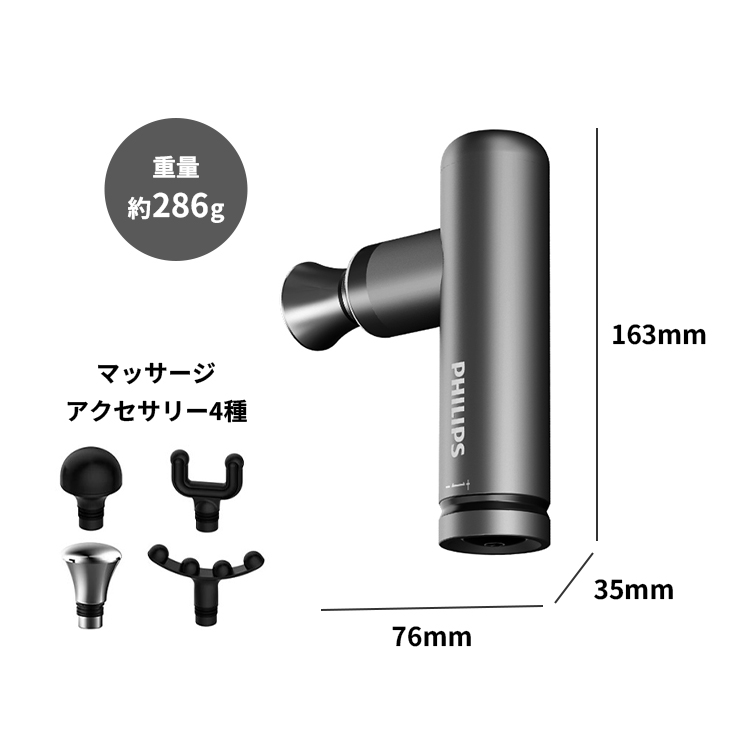 | 世界的家電ブランド PHILIPS(フィリップス)による、コンパクトで高性能な“メタル筋膜リリースガン”です。軽量かつコードレスで、肩・腰・脚・全身の筋肉ケアを手軽に行えます。 こんな方におすすめです ●軽くて扱いやすいマッサージガンを探している方 ●日常の肩・首・腰のこりを手軽にケアしたい方 ●スポーツ後のリカバリーを短時間で済ませたい方 ●外出先でも使えるコンパクトモデルがほしい方 ●しっかりパワーのある小型マッサージガンを求める方 |