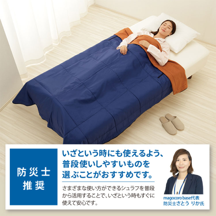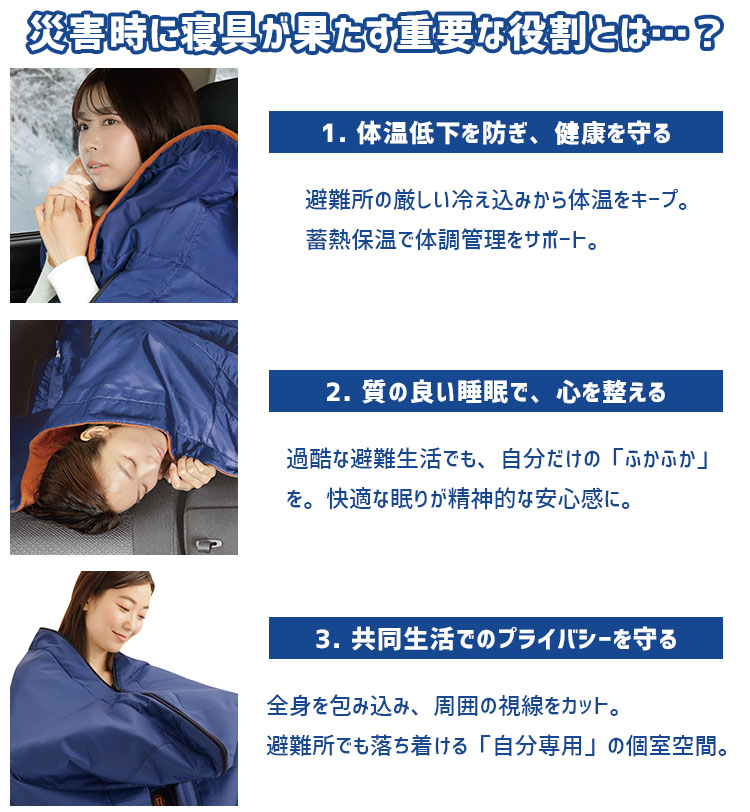 ![]() 寝具メーカーの防災士が考案 防災寝袋 モッテテプラス | ![]() 防災ニモナル 多機能シュラフ |