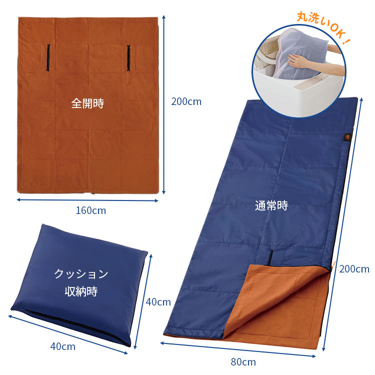 | サイズ(約) | 全開時:160cm×200cm 寝袋時:80cm×200cm 収納時:40cm×40cm |