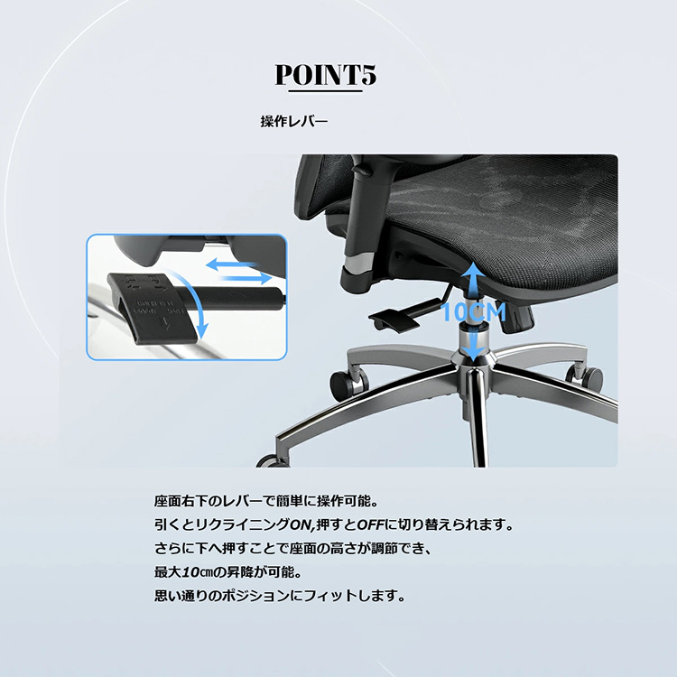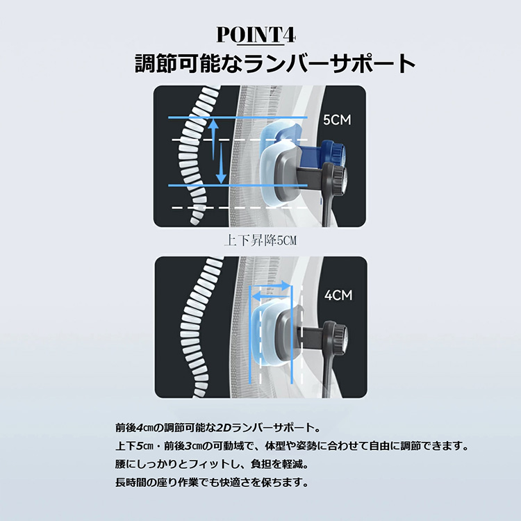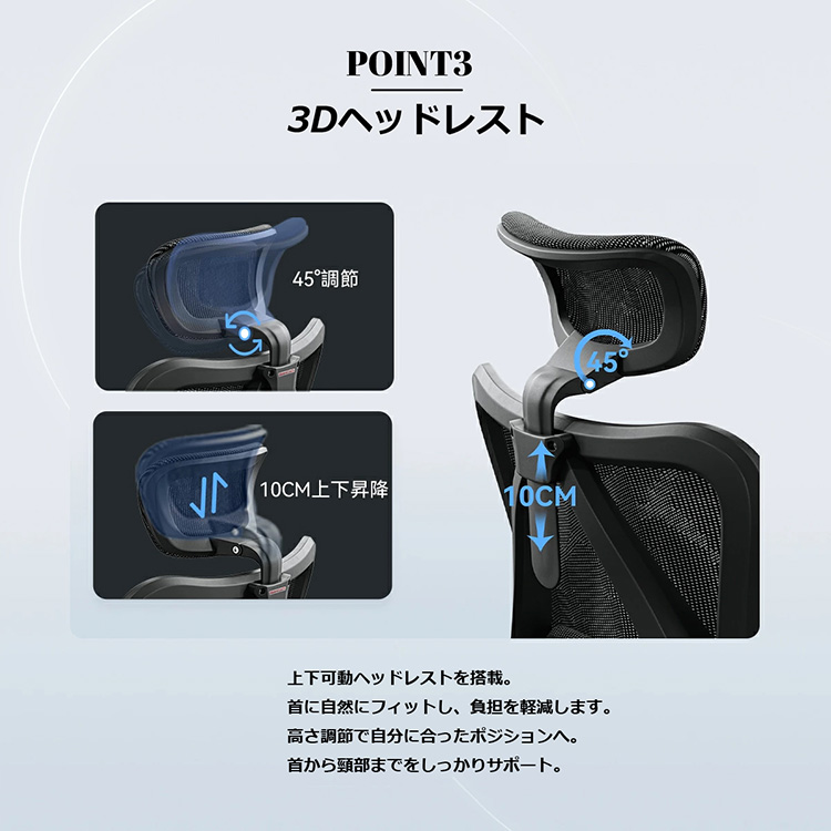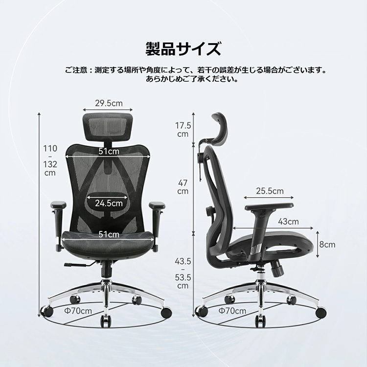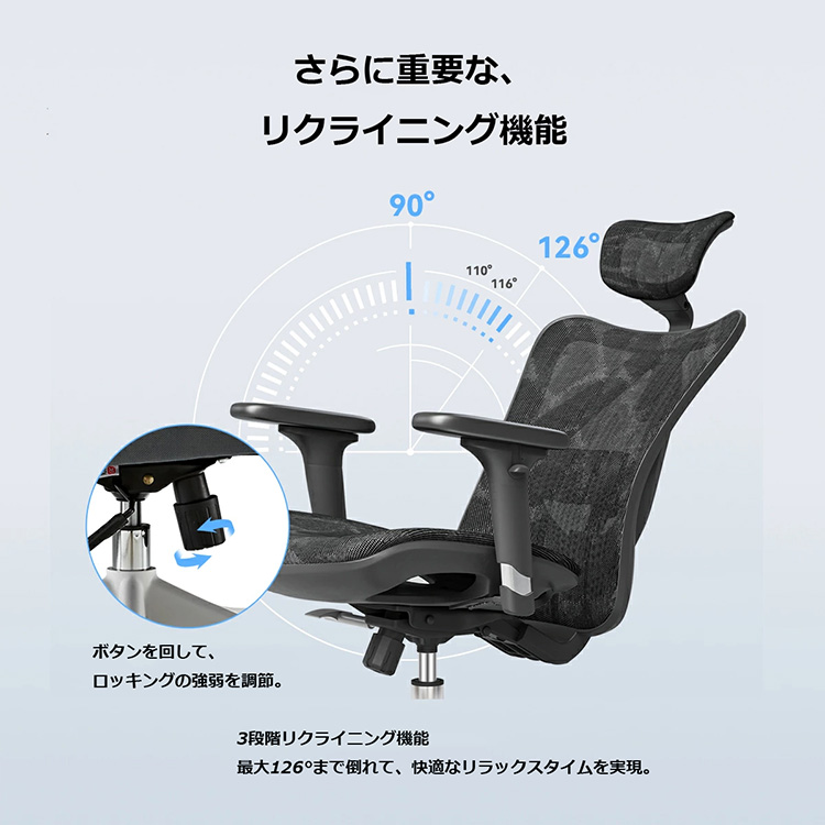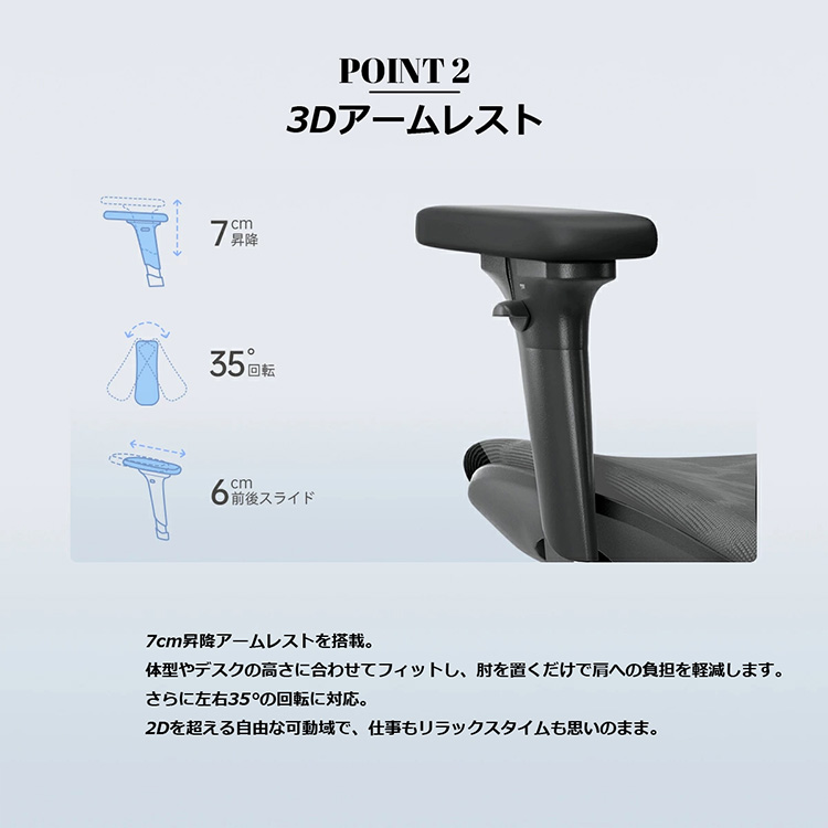 | 仕様 | ●ヘッドレスト:2D(上下9cm昇降、45度角度調整) ●アームレスト:3D(7cm昇降、35度回転、6cm前後スライド) ●ランバーサポート:上下5cm、前後4cm調整可能 ●リクライニング:最大126度(3段階調整) ●認証:BIFMA規格合格、SGS認証ガスシリンダー |