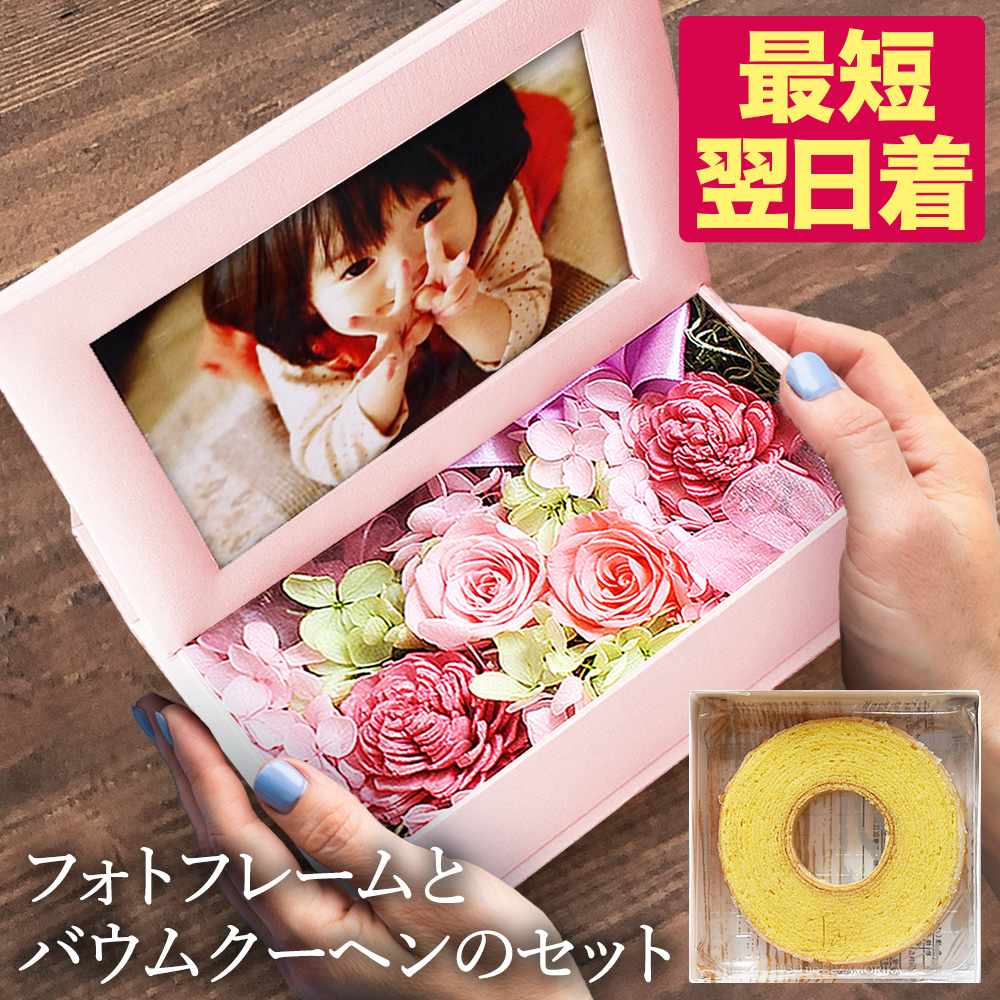 プリザーブドフラワー 枯れない生花のスイーツセット!フォトフレーム お歳暮 クリスマス 数量限定 アレンジ KAREN シェ・タニの絶品バウムクーヘン付 スイーツ 誕生日 結婚祝 お歳暮 クリスマス クリスマス プリザ プリザードフラワー 写真プリント 写真付き 写真入り プレゼント 写真立て 写真たて フォトフレーム プリザーブドフラワー お彼岸 カーネーション 母の日