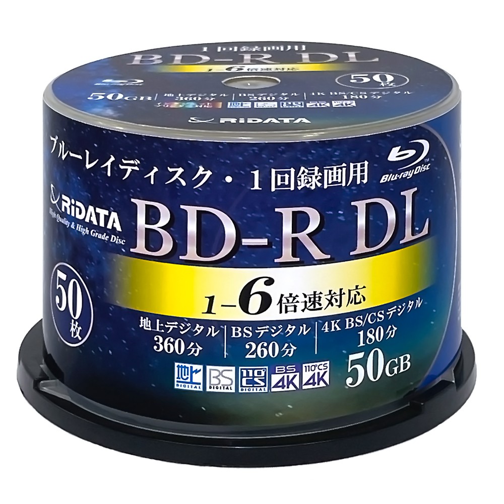 BD-R DL ブルーレイディスク 50枚 RiDATA ライデータ 1回録画用 50GB 片面2層 地デジ360分 1-6倍速 ワイドプリンタブル 50枚スピンドル BR260EPW6.X50SP ◆宅