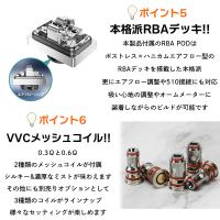 | ●VVC-30 ・抵抗値:0.3Ω ・コイルタイプ:メッシュ ・推奨出力:30W-45W ●VVC-60 ・抵抗値:0.6Ω ・コイルタイプ:メッシュ ・推奨出力:18W-26W | |
