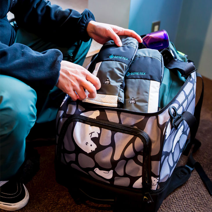 ヘルメット・ブーツが収納できボードを装着できる大容量のウィールバッグ