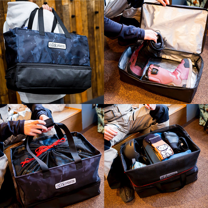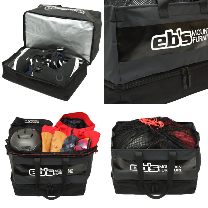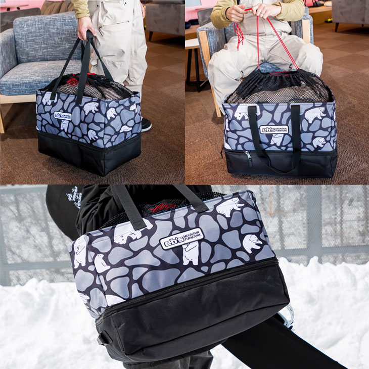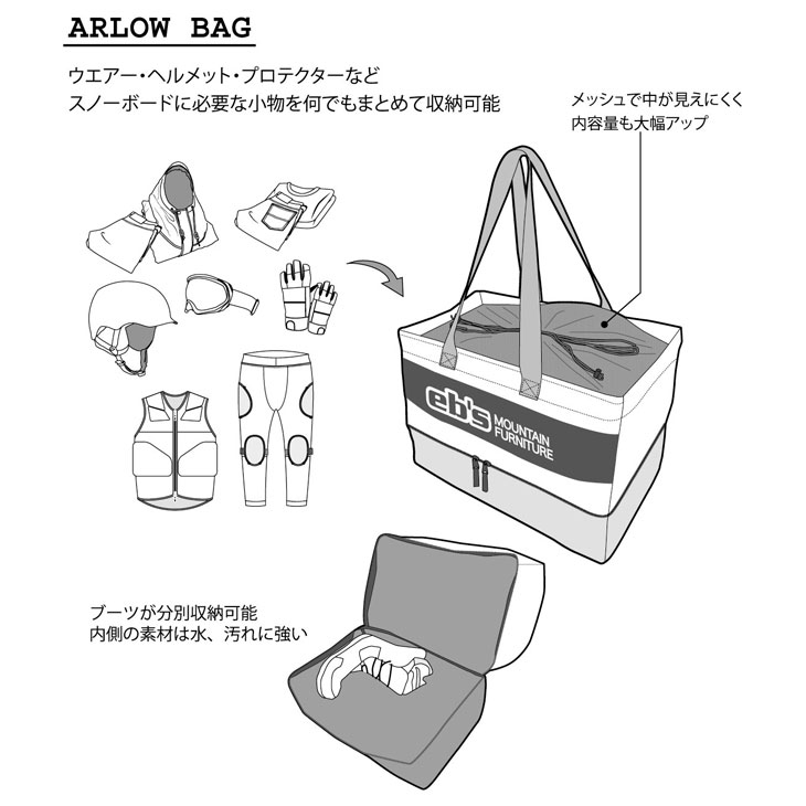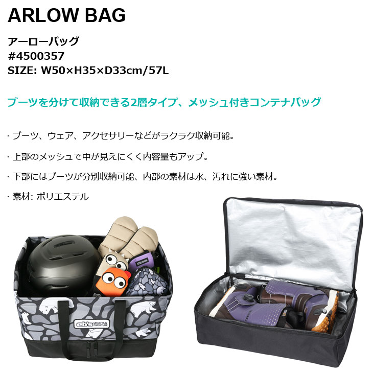| - ARLOW BAG - アーローバッグ #4500357 SIZE: W50×H35×D33cm/57L ブーツを分けて収納できる2層タイプ、メッシュ付きコンテナバッグ ■ ブーツ、ウェア、アクセサリーなどがラクラク収納可能。 ■ 上部のメッシュで中が見えにくく内容量もアップ。 ■ 下部にはブーツが分別収納可能、内部の素材は水、汚れに強い素材。 ■ 素材: ポリエステル |