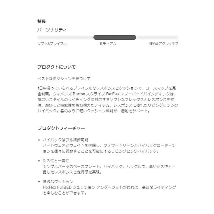*3Dマウンティングシステム搭載スノーボードに取り付けるには、3D ヒンジ ディスク(別売りBURTON社より購入できます)が必要です。 3Dパターンシステムは、2014年より前に製造されたBurtonのボードに採用されています。 Scribe Re:Flex スクライブ ベストなポジションを見つけて 1日中滑っていられるプレイフルなレスポンスとクッションで、コースマップを完全制覇。 ウィメンズ Burton スクライブ Re:Flex スノーボードバインディングは、幅広いスタイルのライディングに対応するソフトなフレックスとレスポンスを提供。 遊び心と機能性を兼ね備えたアイテム。レスポンスに優れたリビングヒンジのハイバック。 雲のように軽いクッション機能が、着地をサポート。 ●ハイバックはフル調節可能 ハードウェアとウェイトを排除し、フォワードリーンとハイバックローテーションを個々に調節することを可能にするリビングヒンジハイバック。 ●耐久性と一貫性 シングルパーツのベースプレート、ハイバック、バックルで、高い耐久性と一貫したレスポンスと走行感を実現。 ●快適なクッション Re:Flex FullBED ジュッション アンダーフットがあれば、長時間ライディングを楽しむことができます。 【スペック】 ■マウンティングシステム Re:Flex ■Baseplate Materials 頑丈なポリカーボネイト ■Ankle Straps / Buckles Reactstrap Smooth Glideバックル ■Toe Straps / Buckles Supergrip Capstrap Smooth Glideバックル ■Hi-Back FLAD DialFLAD ■サステナビリティ 再生素材を含む ■保証 Burtonの全てのバインディングベースプレートはライフタイムワランティの対象となり、Burtonのストラップおよびハイバックは購入日から1年間の保証が適用されます。 【技術的な詳細】 マウンティングシステム - Re:Flex ウェイトを軽減しながらボードフレックスを大幅に向上させ、より自然なフィールをもたらすRe:Flexマウンティングシステム。すべてのマウンティングシステムに対応。 ハイバック - DialFLAD 簡単なダイヤル操作でハイバックのフォワードリーンアングルを好みの角度に調整できるLiving Hingを採用したDialFLAD。 フォワードリーンを大きくするとアクティブなクイックレスポンス、小さくすると落ち着いたレスポンスに。 バックル - Smooth Glideバックル バックルはスムーズグライド式で締めやすく、スムーズにしっかりと装着できます。 頑丈な素材を採用し、山でその真価が発揮される信頼の機能性と耐久性を実現。 - レディースバインディング+ブーツ サイズチャート - 【S】 US/4-US/6(21.0cm-23.0cm) 【M】 US/6-US/8(23.0cm-25.0cm) 【L】 US/8-(25.0cm-) ●メーカーから当店への納品の時点で稀にパッケージ箱が潰れているものがございます。箱の破損によるクレームはお受けできません。予めご了承の上ご注文お願いいたします。 ●ご注文可能でも欠品の場合もございます。(複数店舗在庫共有のため)その際はキャンセルさせていただきます。 ●商品画像について:撮影環境やモニターにより実物とカラーの見え方や色味が異なる場合がございます。 |