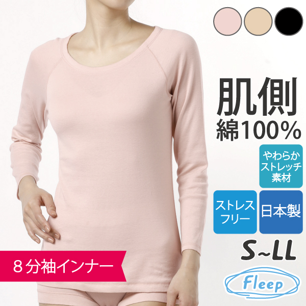シンプル 8分袖インナー お肌にやさしい下着 Fleep フリープ ロンT Tシャツ インナーウェア 日本製 ネコポス可 81064 S M L LL