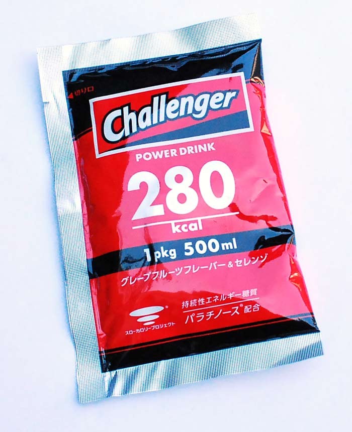 PowerDrink「Challenger」(チャレンジャー)はゆっくり消化吸収されるパラチノースが主原料となる粉末清涼飲料で、1袋70gを500mlの水またはお茶等に溶かすと、今までにない280kcalの高エネルギー飲料ができあがります。