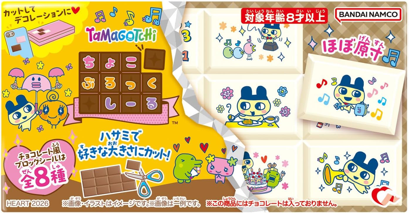 懐かしのたまごっちたちがかわいいシールに♪板チョコモチーフのタイルデザインでデコレーションにも使えます。