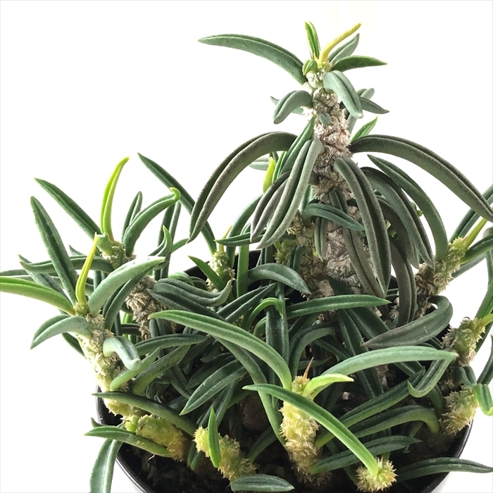 ■ 特徴 | 種小名の'キリンドリフォリア'は、「円筒状の葉の」という意味があります。 地面に埋まった塊根から多肉質の枝を伸ばす小型塊根系のユーフォルビアです。 枝はあまり縦には伸びず横方向に匍匐するように伸びていきます。 ボートのような形状のダークグリーンの葉は、やや多肉質で硬い質感です。 | ■ 置き場所 | 一年を通して日当たりと風通しの良い場所で管理します。 日光不足や風通しが悪い場所では枝が徒長してしまうので注意が必要です。 寒さにとても弱いので、冬は暖かい屋内で管理します。 休眠中もなるべく日光に当てましょう。 | ■ 水やり | 成長期は用土が乾いてから水やりをします。 塊根から枝を伸ばすタイプのユーフォルビアは水を与えすぎると 枝が徒長しやすいのでなるべく控えめにします。 気温が下がり始めた頃から徐々に量と回数を減らし、晩秋から春までは断水気味に管理します。 休眠期の冬でも月に2,3回程度土を軽く湿らす程度に水やりし、細根の枯死を予防しましょう。 加温している温室では冬になっても休眠に入らない場合もありますので、その際は適度に水やりします。 | ■ サイズ・その他 | 7.5cmポット 1ポット 入荷時期によって色づき方や大きさなど異なる場合がございますのでご理解のうえお買い求めください。 |