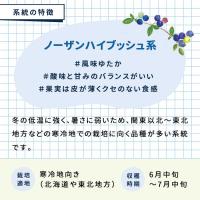 ノーザンハイブッシュ系は冬の低温に強く、暑さに弱いため、関東以北〜東北地方などの寒冷地での栽培に向く品種が多い系統です。 風味ゆたかで、酸味と甘みのバランスもよく、果実は皮が薄くクセのない食感が特徴です。 【栽培適地】寒冷地向き(北海道や東北地方) 【収穫時期】6月中旬〜7月中旬 14品種からお選びいただけます (1)ブルーマジシャン (2)レカ (3)ブリジッタ (4)エリザベス (5)ブルーゴールド (6)スパルタン (7)ヌイ (8)プル (9)ブルーレイ (10)ケープフェア (11)チャンドラ (12)レイトブルー (13)デューク (14)ウェマンス |