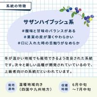 サザンハイブッシュ系は冬が温かい地域でも栽培できるよう改良された系統です。次々と新しい品種が開発されていているので、上級者向けの系統だといわれています。 酸味と甘味のバランスがあり、果実の皮は薄くやわらかい。また、口に入れた時の舌触りがなめらかな特徴があります。 【栽培適地】温暖地域向き(四国や九州地方) 【収穫時期】6月中旬〜7月中旬 10品種からお選びいただけます (1)オニール (2)シャープブルー (3)ガルフコースト (4)クーパー (5)レガシー (6)ジュエル (7)ピロキシー (8)ジョージアジム (9)リベイユ (10)ミスティー |
