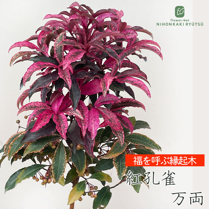紅孔雀万両は、冬には鮮やかな赤い実をたわわに実らせる常緑低木で『縁起木』『開運植物』として古くから親しまれています。