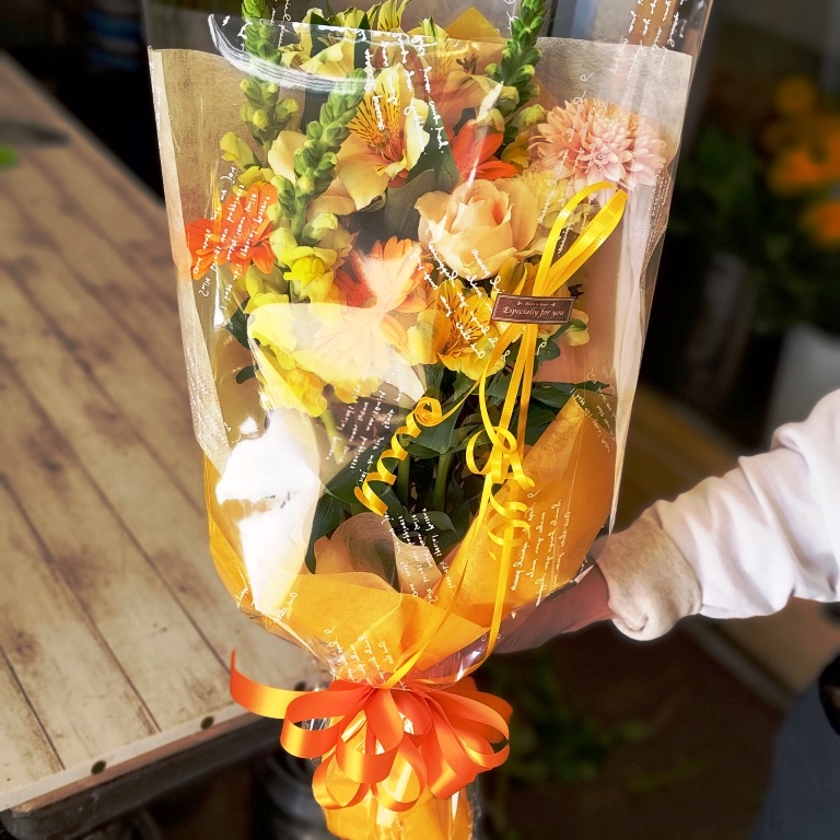 明るく前向きな気持ちを届けてくれる、黄色系の縦長ブーケです。