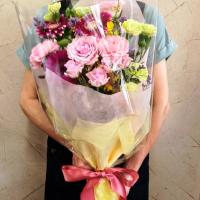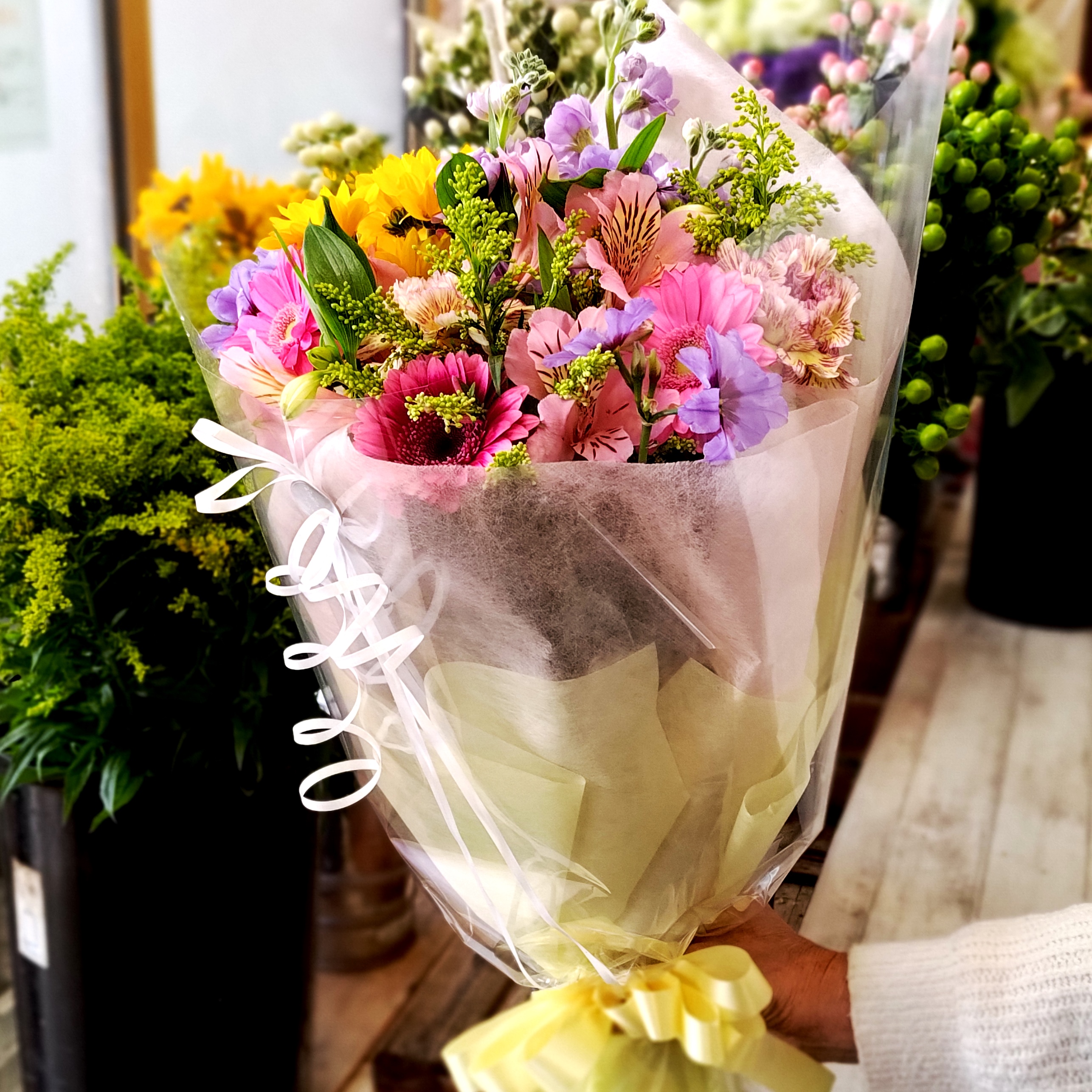 色やお花の種類はフローリストにおまかせいただく、縦長スタイルの花束です。