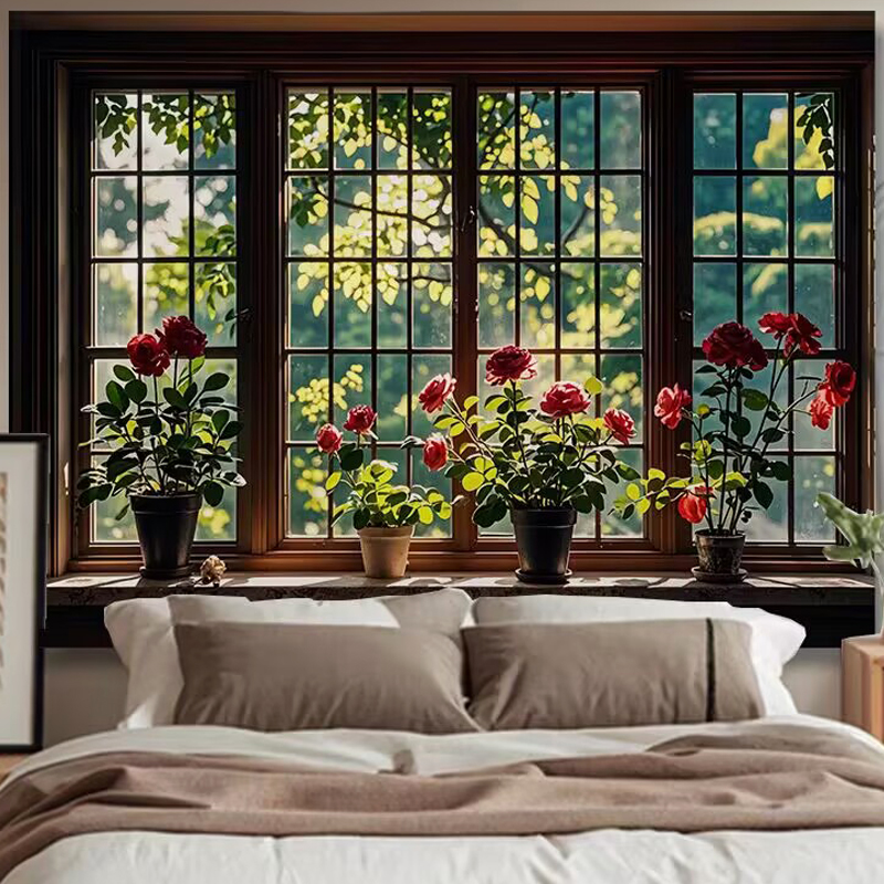 タペストリー 壁掛け 壁飾り インテリア ファブリックポスター おしゃれ 部屋飾り 背景布 目隠し 寝室 カーテン 花のある窓辺と緑の絵柄 幅100cmx縦70cm