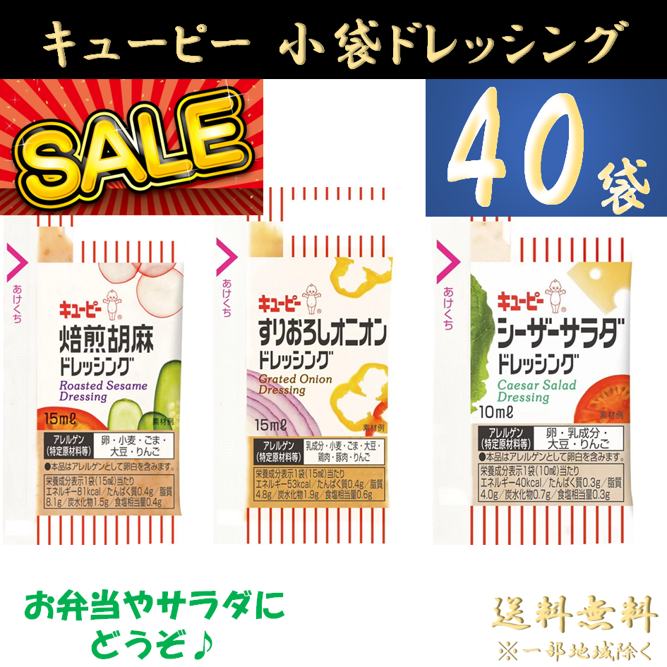 キユーピー ドレッシング 小袋 お弁当 40個 [ すりおろしオニオン シーザーサラダ 焙煎胡麻 ] セール 使い切り ポーション 個包装 大容量 ポイント利用 お試し