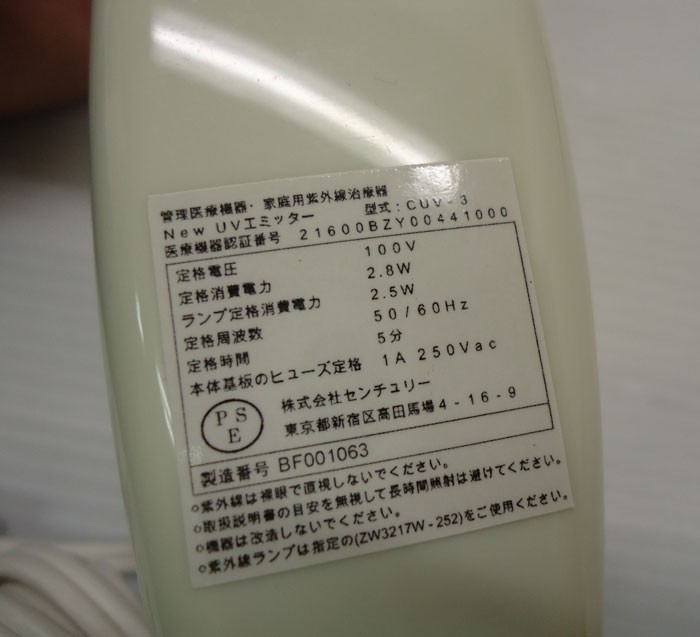 | ご覧いただきありがとうございます。 家庭用紫外線治療器 New UVエミッター CUV-3 管理医療機器 囗Gを出品します。 <品質ランク> A <付属品> 欠品はありません。 <状態の特記事項> 通電テスト済みです。 状態は写真にてご確認願います。細かい状態について気になる方は、入札前にお問い合わせ願います。 写真が全てです。写真をご確認の上、入札お願い致します。 中古品ですので、ノークレーム、ノーリターンでお願い致します。 |
