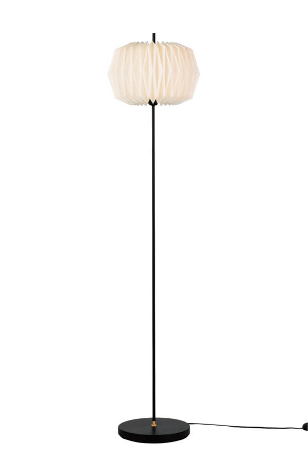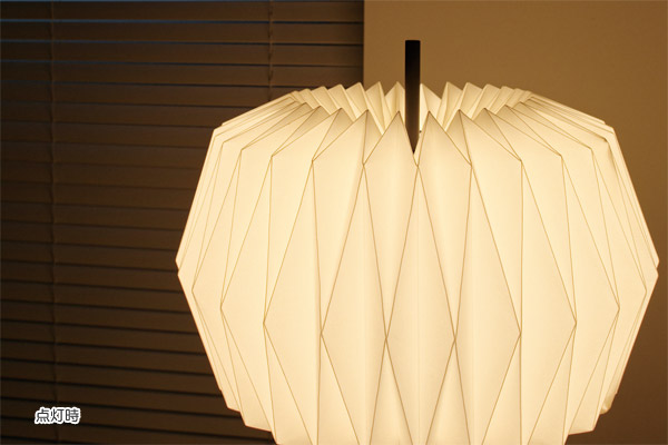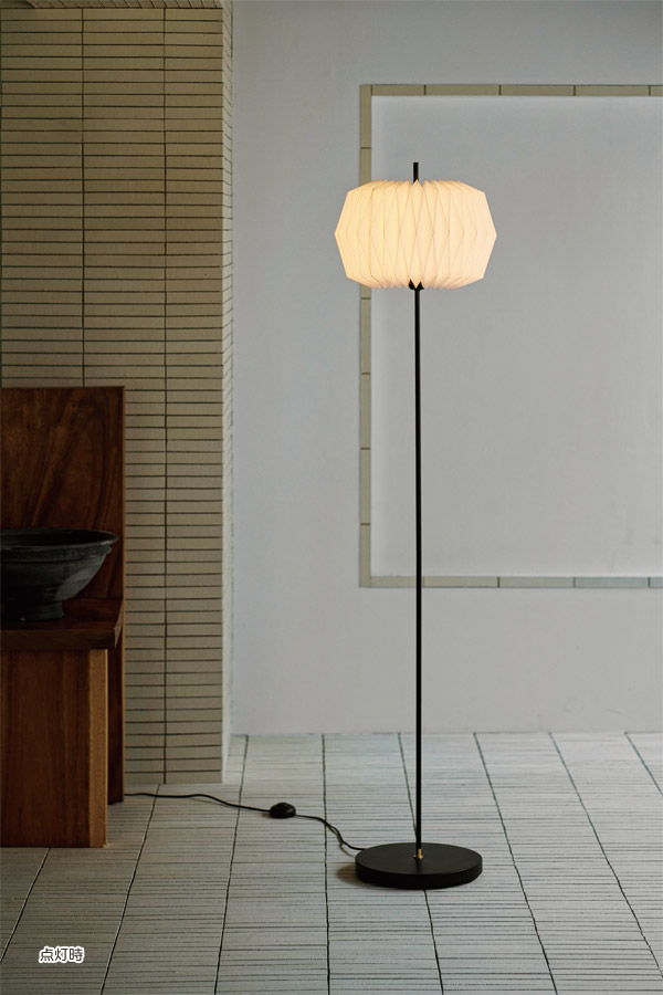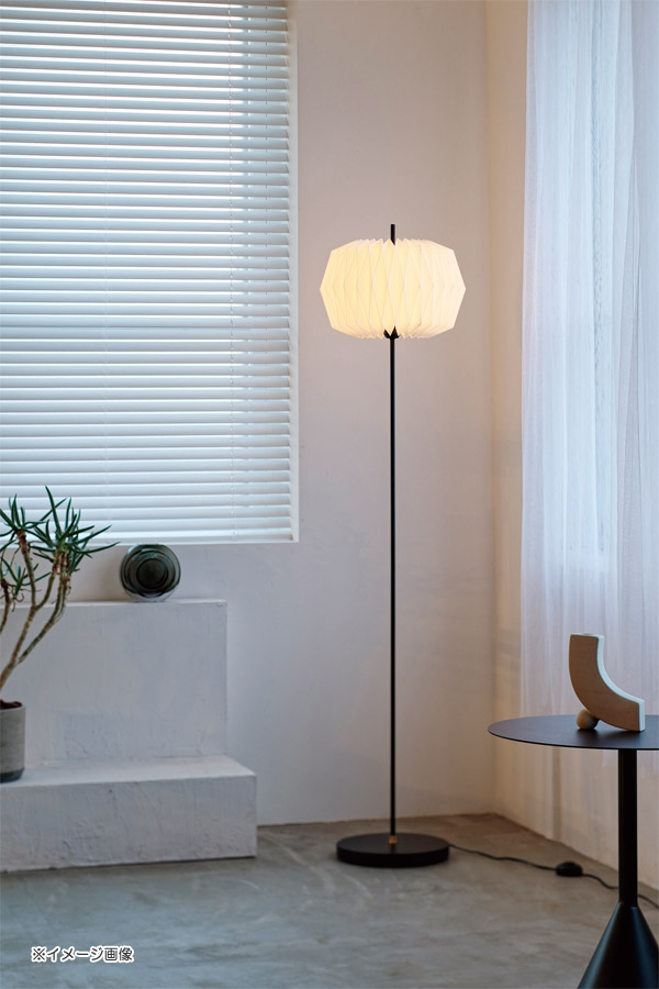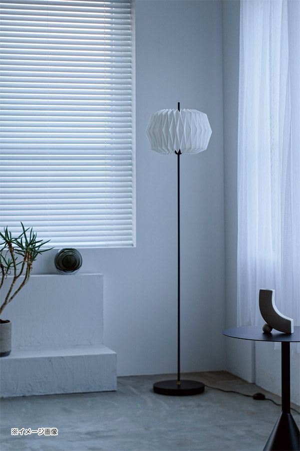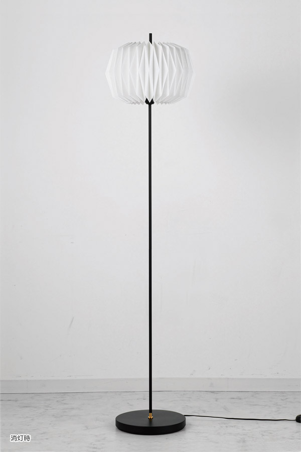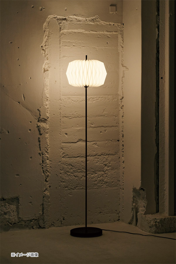 茶道具のひとつ【雪洞】からインスパイアされた、幻想的な光を放つデザインのオスクフロアーライト。折り紙のように布を折って作り上げる美しい形状が繊細な陰影を湛えます。最小限まで細くした支柱がスラリと伸び、セードを突き抜けるモダンなプロポーションを形成しています。