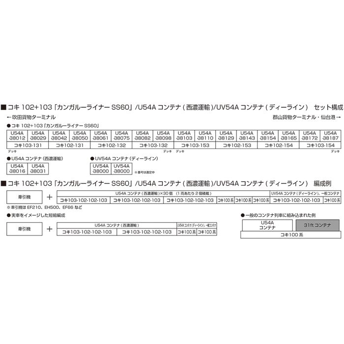 統一感のある編成が美しい人気のコンテナ列車「カンガルーライナーSS60」を製品化いたします。4両で1ユニットが特徴のコキ102・103、西濃運輸のU54Aコンテナを新規製作。また同列車の牽引機にも充当され人気を集めた 3090-5 EF66 27 JR貨物更新車 も同時発売予定です。当セット2組とお好みのコキ100系4両を合わせると迫力のフル編成を再現可能です。また、同列車の一般枠に頻繁に積載されるUV54Aコンテナ(ディーライン)も同時に製品化、よりリアルな編成をお楽しみいただけます。【車両解説】「カンガルーライナー」は、JR貨物を主軸に運行している西濃運輸向けの混載ブロックトレインです。編成両数や行先が異なる3列車が設定されており、それぞれSS60、NF64、TF60と名付けられています。中でも最初に導入されたのが「カンガルーライナーSS60」で、平成30年(2018)に運行を開始、大阪府の吹田貨物ターミナル駅と、福島県の郡山貨物ターミナル駅・宮城県の仙台港駅を結んでいます。20両編成のうち15両が西濃運輸の専用、残りの5両は一般のコンテナを積載して運行されています。【製品特徴】 青地に黄色の帯が入ったシンプルなデザインが特徴の西濃運輸所有のU54Aコンテナを製品化 同列車向けに新製されたU54A38000番台のうち38041〜38190のグループを再現 共用されている38004〜38033のグループやディーラインの通風コンテナ(UV54A38000番台)も単品で製品化 ディーラインのUV54Aは妻面の通風孔を印刷で表現 コンテナ貨車は4両1ユニットのコキ102/103を新規製作(奇数車は偶数車を流用のため一部仕様が実車と異なります) コキ102/103は床面が抜けている台枠に配管などのディテールが見えるフレーム形状を細密に再現 コキ102/103ともに車体色はブルー、JRFマーク無しの仕様で再現 コキ105と比べて低い位置にある側面ブレーキハンドル、コキ102にはデッキが無く両端のコキ103のみにデッキがある特徴的な外観を再現 編成最後尾に取り付ける反射板を付属