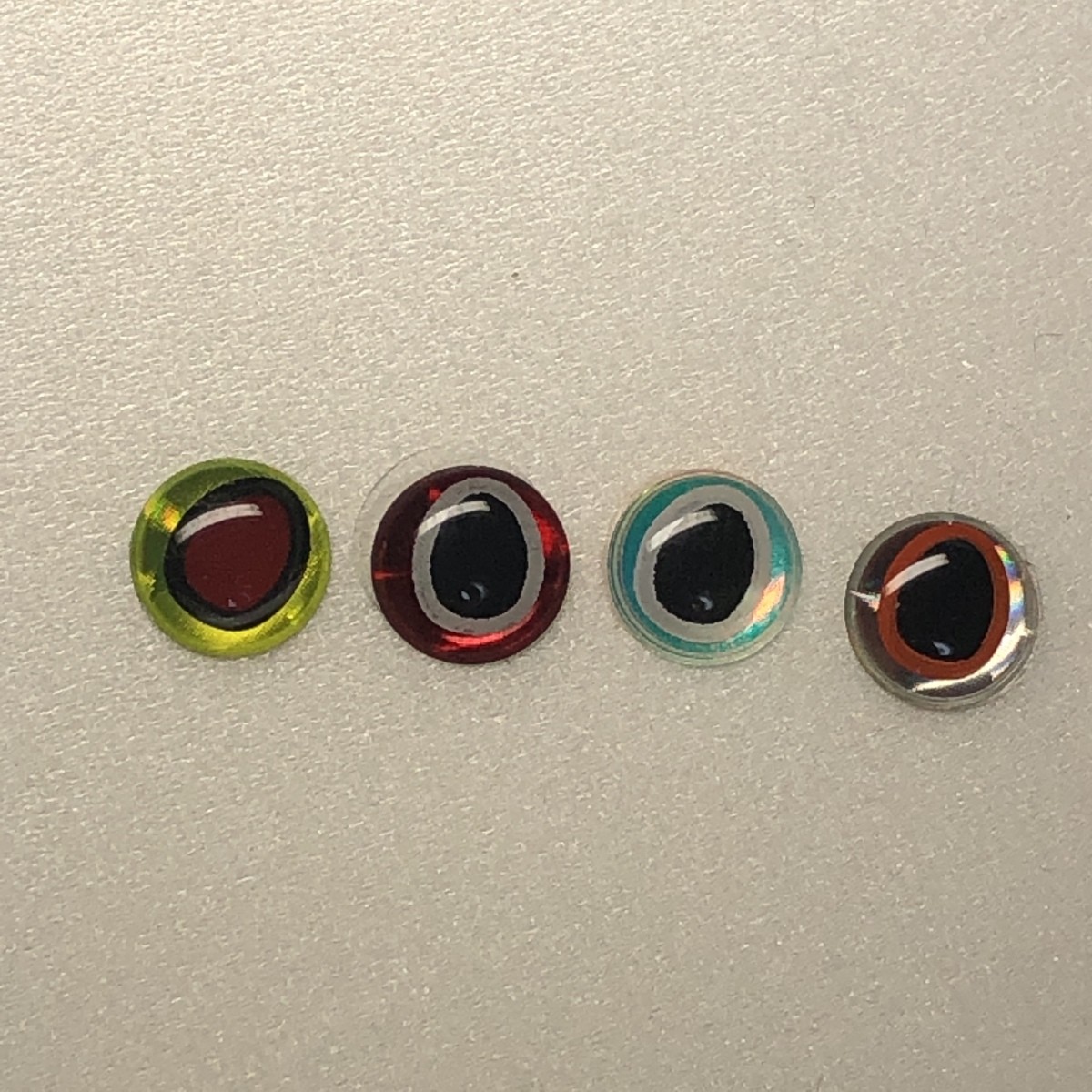 楕円形の瞳を持つ3Dアイのシールです。爬虫類、両生類、そして魚類それぞれのイミテーションフライがとてもリアルになります。