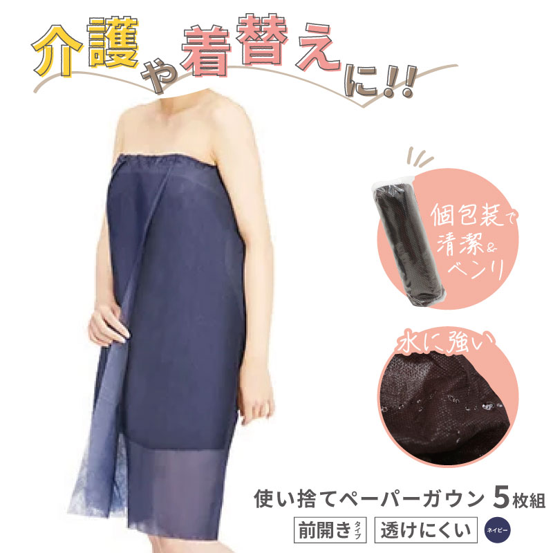 ■5枚組■ ペーパーガウン 前開き ネイビー ガウン 使い捨て 不織布 エステ 着替え ポンチョ ケープ 旅行 入院 介護