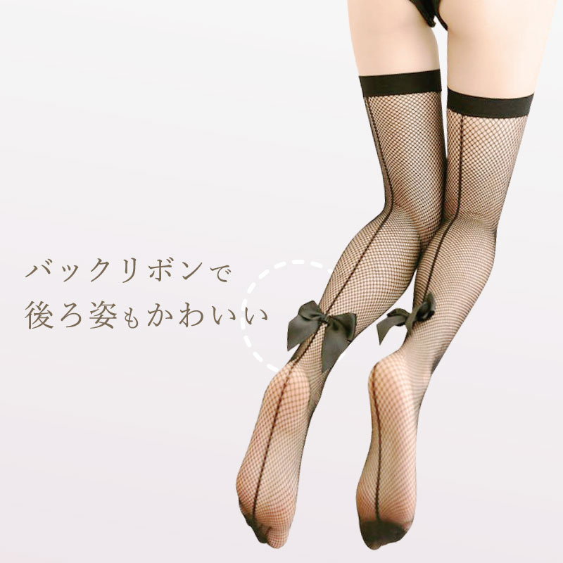 バックリボン網ガーターストッキング ブラック 黒 パンティストッキング セクシー ランジェリー ニーハイ 網 あみ 網タイツ プレーン メッシュ