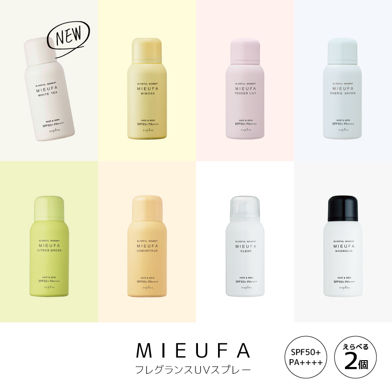 香りとケアにこだわったUVケアスプレー「MIEUFA」。6種類の香りと、無香料の全7種類からお選びいただけます。