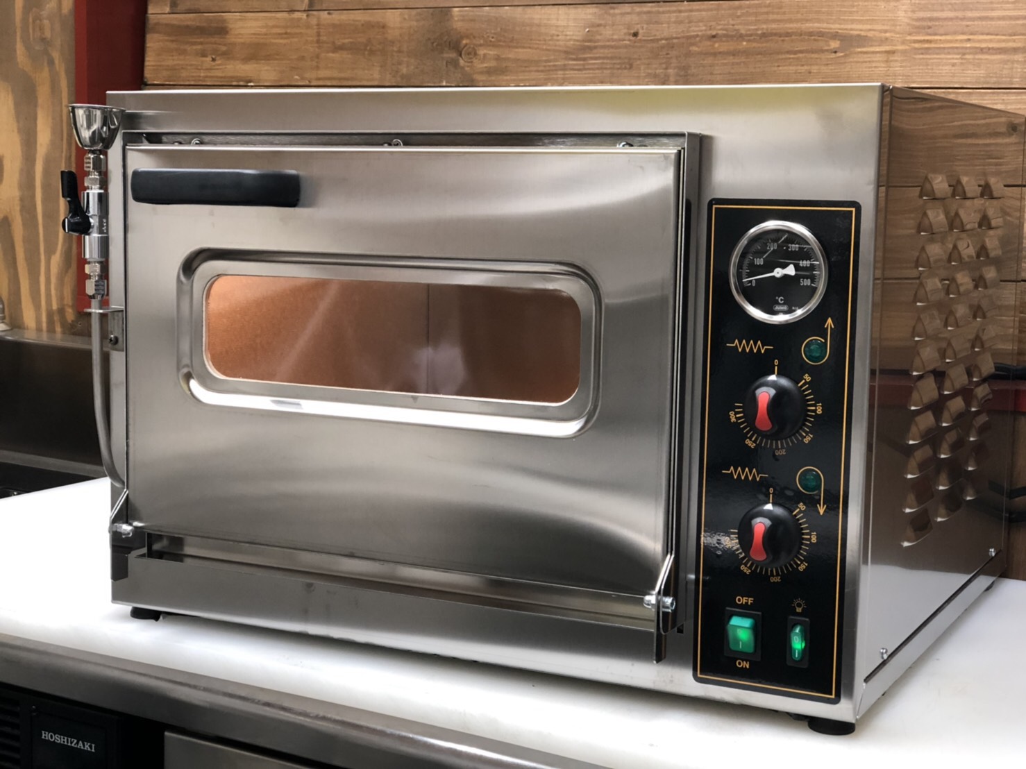 200V・単相仕様のため、高電圧引き込み工事が不要です。手動式のスチーム機構を搭載しているためハード系パンも焼成できます。電源投入後、わずか20分程度で230℃まで昇温します。