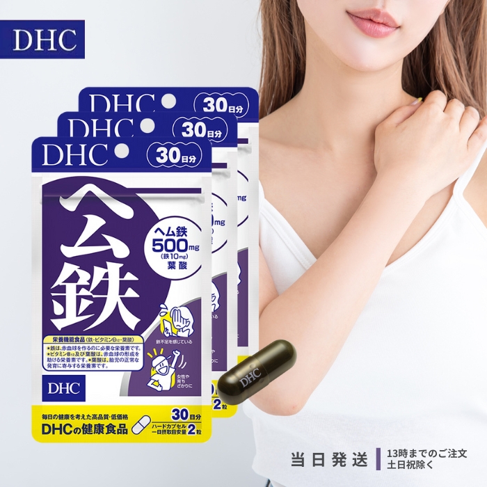【DHC ヘム鉄 60日分の商品詳細】●鉄、ビタミンB12、葉酸の栄養機能食品です。●「ヘム鉄」は、とりわけ女性に不足しがちな鉄分を効率よく補えるサプリメントです。●鉄分は身体への吸収率が悪く、カルシウムと並び積極的に補給したいミネラルのひとつ。食品に含まれる鉄には、肉や魚などの動物性食品に多いヘム鉄と、野菜や穀物などに含まれる非ヘム鉄があります。ヘム鉄を含む動物性食品の方が鉄の吸収率が高いことが一般的に知られています。●お茶やコーヒーのタンニンと反応しないヘム鉄に、ビタミンB12、葉酸をプラス。●鉄不足が気になる方や、育ちざかりの方におすすめです。●栄養機能食品。【栄養成分(栄養機能食品)】鉄、ビタミンB12、葉酸【保健機能食品表示】・鉄は、赤血球を作るのに必要な栄養素です。・ビタミンB12及び葉酸は、赤血球の形成を助ける栄養素です。・葉酸は、胎児の正常な発育に寄与する栄養素です。【基準値に占める割合】鉄:147%、ビタミンB12:42%、葉酸:31%【1日あたりの摂取目安量】2粒【召し上がり方】1日2粒を目安にお召し上がりください。一日摂取目安量を守り、水またはぬるま湯でお召し上がりください。【品名・名称】ヘム鉄加工食品【DHC ヘム鉄 60日分の原材料】ヘム鉄、ゼラチン、グリセリン脂肪酸エステル、セルロース、着色料(カラメル、酸化チタン) 、微粒二酸化ケイ素、葉酸、ビタミンB12【栄養成分】2粒(692mg)あたり熱量:2.8kcal、たんぱく質:0.48g、脂質:0.07g、炭水化物:0.06g、食塩相当量:0.025g、鉄:10.0mg、葉酸:75μg、ビタミンB12:1.0μg【アレルギー物質】ゼラチン【保存方法】直射日光、高温多湿な場所をさけて保存してください。【注意事項】・開封後はしっかり開封口を閉め、なるべく早くお召し上がりください。・お身体に異常を感じた場合は、飲用を中止してください。・原材料をご確認の上、食物アレルギーのある方はお召し上がりにならないでください。・薬を服用中あるいは通院中の方、妊娠中の方は、お医者様にご相談の上お召し上がりください。・本品は、多量摂取により疾病が治癒したり、より健康が増進するものではありません。1日の摂取目安量を守ってください。・葉酸は、胎児の正常な発育に寄与する栄養素ですが、多量摂取により胎児の発育が良くなるものではありません。・本品は、特定保健用食品と異なり、消費者庁長官による個別審査を受けたものではありません。・食生活は、主食、主菜、副菜を基本に、食事のバランスを。【原産国】日本