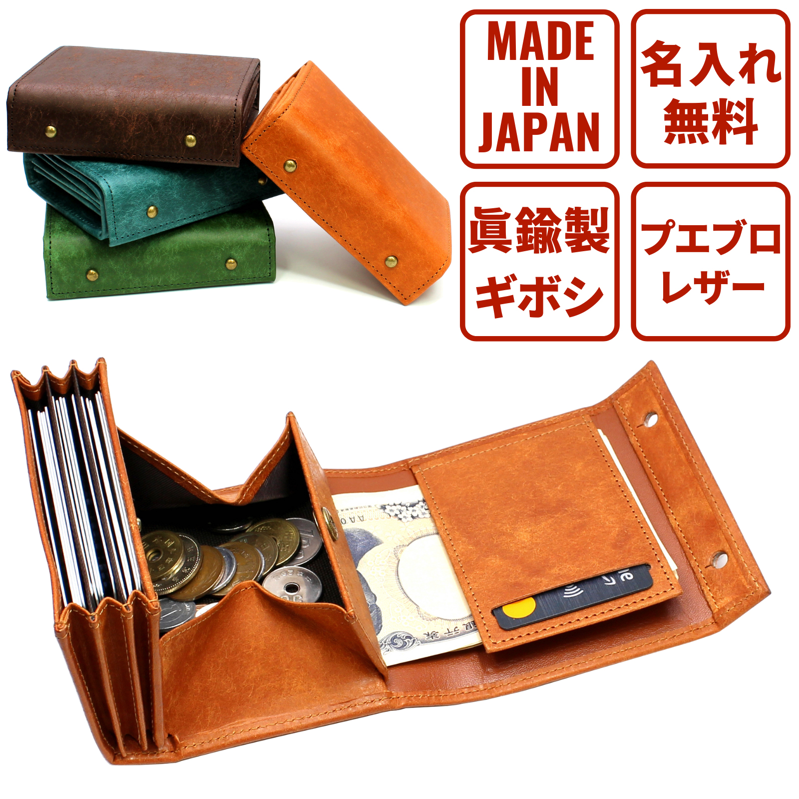【仕様】開閉 ギボシ留め 札入れ×1 ボックス式小銭入れ×1 カード入れ×4
