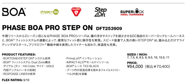 PHASE BOA PRO STEP ONフェーズ ボア プロ ステップオン今期リリースから3シーズン目となるPHASE BOA PROシリーズは、踵の浮きやスリップを減少させるDC独自のスーパーロックヒールハーネスと、