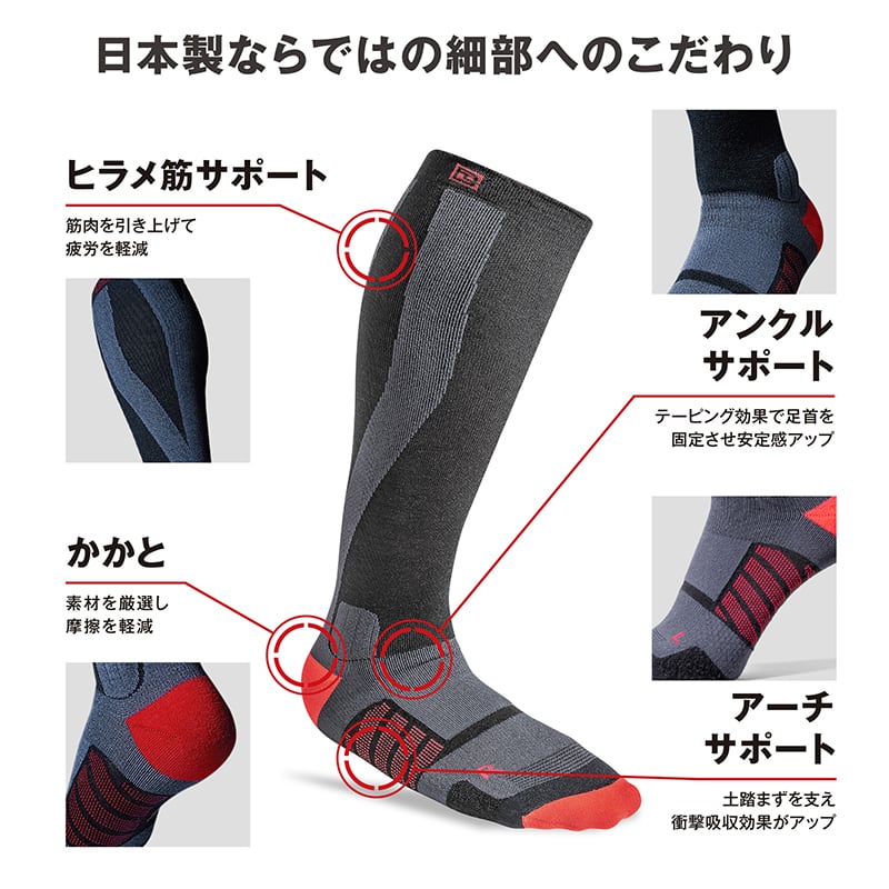 人間工学に基づいて作られたこのソックスは段階着圧設計で血液を循環させ、疲れを軽減してくれる。