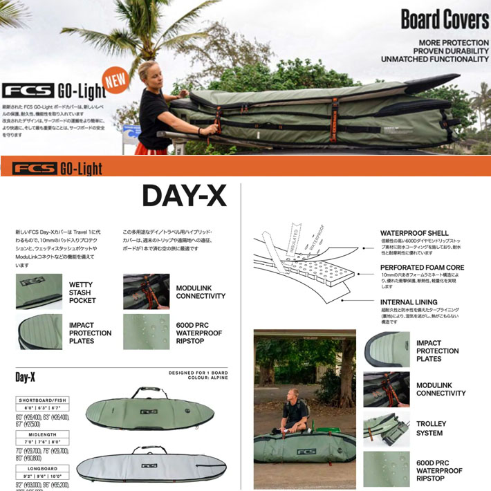 FCS サーフボードケース 正規販売店Day-X Mid-Length Cover デイエックス ミッドレングス新型FCS Day-XカバーはTravel 1の後継モデルで、10mmのパッド入り保護機能に加え、ウェットスーツ収納ポケットやModuLink?接続機能などを備えています。