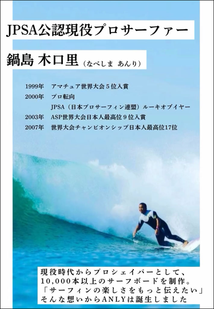 made in Japan世界ランク9位のプロサーファー、鍋島木口里が手掛けるサーフブランド。