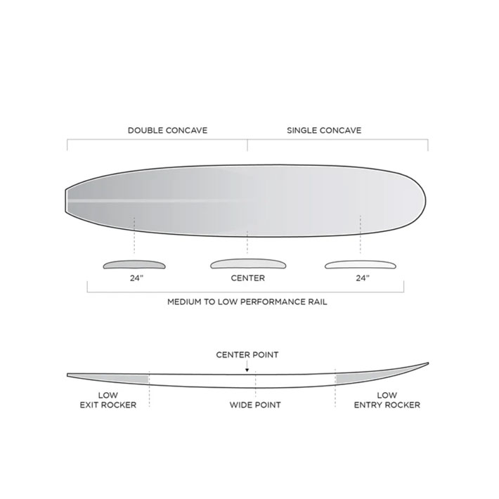 ワイドでシングルコンケーブが入ったノーズと、ハードエッジなスクエアテールを特徴とし、全てのレベルのロングボーダーにロングボードの楽さを失わせる事なく、
