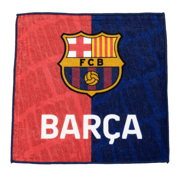 ラ・リーガ FCバルセロナのクラブロゴとエンブレムがデザインされたハンドタオル。