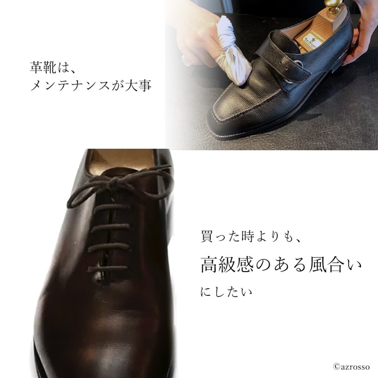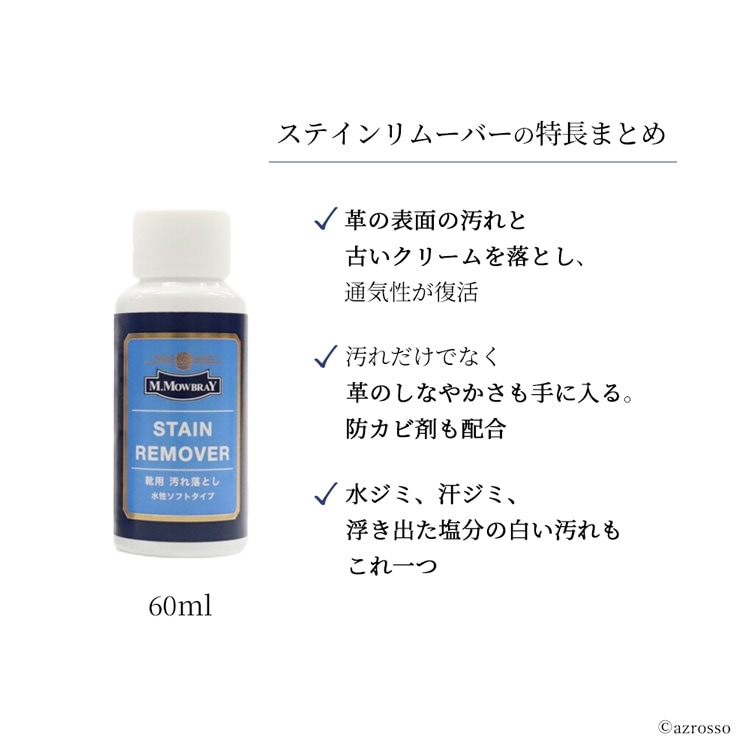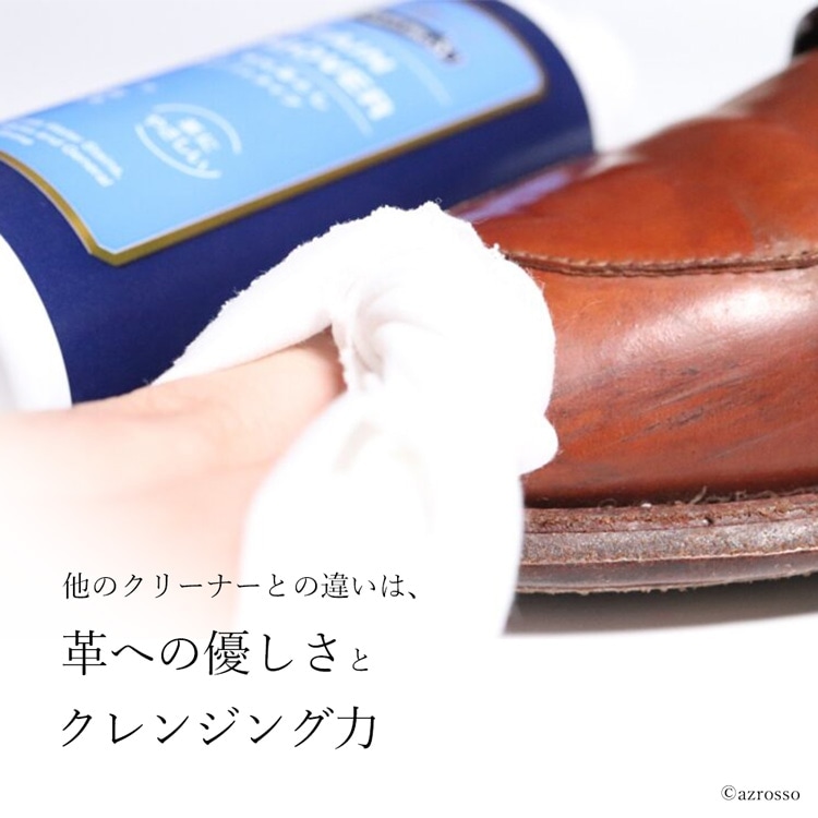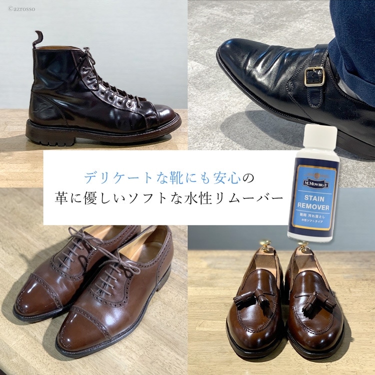 | カラー:ニュートラル(無色) 容量:60ml 靴磨きに不慣れな方でも安心してお使い頂ける、M.MOWBRAYを代表する革靴用の水性汚れ落としです。 靴の表面の汚れや古いクリームを落とすことにより、クリームの浸透性が向上し、表面の通気性も維持されます。 軟水をベースに作られたソフトな仕様ですので、汚れ落ちが抜群ながら、色落ちやシミなどのリスクを軽減しています。 (靴に対して最初に使う際は、目立たない場所でテストしてください。) 雨の後ににじみ出てくる白い汚れ(塩分)もきれいに落ちます。 指がしめる程度の量を別売りの「M.MOWBRAY リムーバークロス」にとり、皮革表面を撫でるように拭くだけで汚れが落ちます。 |